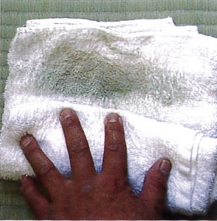 青白い「い泥」で6畳あたり、タオル1枚程度使用します。