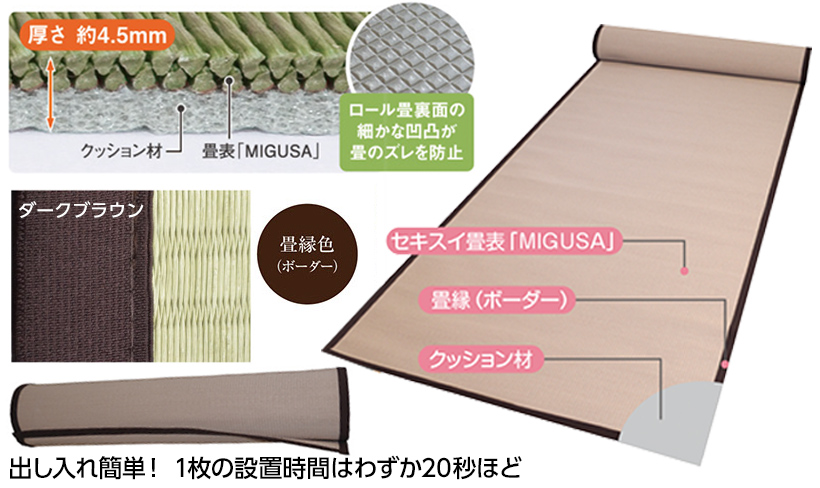ロール畳はさっと広げるだけの簡単設置なので、必要な時にすぐにお使いいただけます。 畳表面にはクッション材を採用していますので足に優しく、教育施設、災害時の避難所など、人々が集う場所におすすめです。